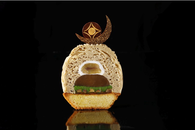 しっとりと口当たりの軽い「豆乳入りバスク生地」を土台に、ほろ苦くも甘みのある「カラメルクリーム」や渋み広がる「抹茶ガナッシュ」、和の素材として「黒蜜羊羹」を新素材として採用。さらに、熊本県産和栗の「甘露煮」を一粒と刻んだものを加え、より栗の香りと食感をお愉しみ堪能できる逸品に。隠し味の青ヶ島の「ひんぎゃの塩」のほど良い塩味が、濃厚で優しい口当たりのマロンペーストや素材の味を引き立たせます。