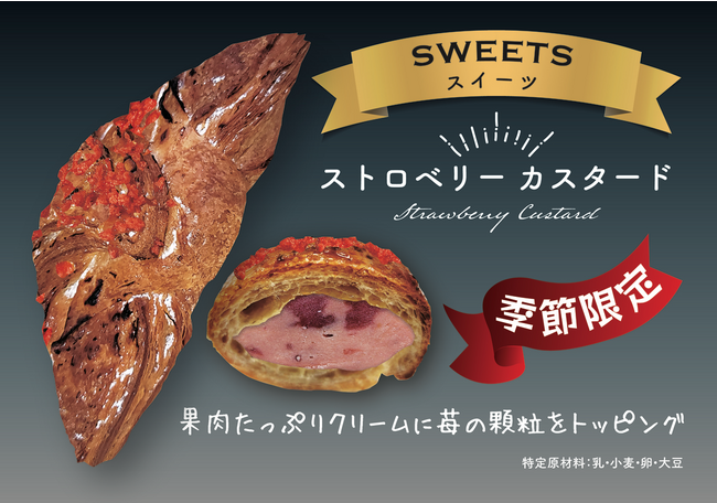 苺の果肉たっぷりクリームに、顆粒をトッピングした苺感満載の季節限定のクロワッサンです。