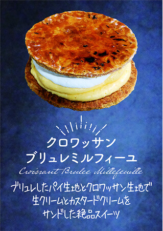 ブリュレしたパイ生地とクロワッサン生地で、生クリームとカスタードクリームをサンドした絶品スイーツ。 さらにクリームの中にはクロワッサンを丸ごと1本使用したラスクもサンドしております。