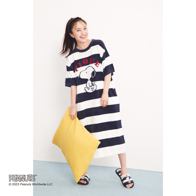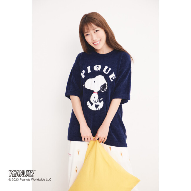 ひんやり冷たく甘いジェラートに、トコトコ歩く赤い首輪のスヌーピーをジャカードでデザインしています。ゆったりとしたサイズ感で、夏のおうち時間にぴったりです。