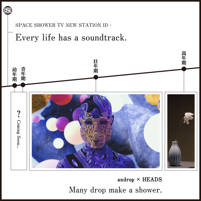 コンセプトは「全ての人生にはサウンドトラックがある」「SPACE SHOWER が、この不思議な世の中を一懸命生きる人々と音楽の橋渡しとなるような存在でありたい」 というメッセージを表現しました。コラボするSPACE SHOWER MUSICのアーティストの個性と、スペシャらしさを表現しながら、 最終的にまとめて見たとき、高年期、壮年期、青年期、幼年期と、一人の人間の人生を表した作品に仕上がっています。 今シリーズ第二弾アーティストして登場したのは、内澤崇仁(Vocal&Guitar)、佐藤拓也(Guitar&Keyboard)、前田恭介(Bass)、伊藤彬彦(Drums)による4人組ロックバンド、androp。そして今回、ディレクションを行ったのは、3DCGを軸としてアートディレクション、ディレクション、アニメーションを手掛けるHEADSが勤めました。本作品のタイトルは「Many drop make a shower.」