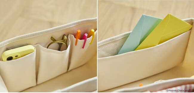 ナチュラルカラーの収納トートバッグは、たっぷりのマチと6つのポケットで使いやすさ抜群。自立するので、リビングの小物やコスメ、文具の収納、車内用の収納やランチバッグとしても使えて、家でも外でも活躍する万能バッグです。