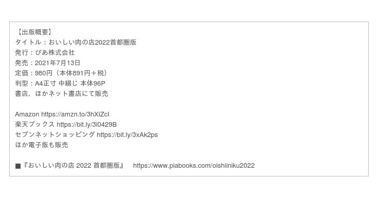 ■『おいしい肉の店 2022 首都圏版』 https://www.piabooks.com/oishiiniku2022