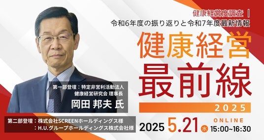 本ウェビナーでは、健康経営推進検討会委員であり、特定非営利活動法人 健康経営研究会 理事長の岡田 邦夫氏をお招きし、健康経営度調査について令和6年度の振り返りと令和7年度の最新情報について解説いただきます。また令和6年度の健康経営銘柄・ホワイト500に選出されましたSCREENホールディングス、H.U.グループホールディングスより、具体的な取り組みについてご紹介いただきます。