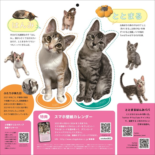 YouTube動画総再生数2000万回超え、Twitterフォロワー数10万人以上と大人気の兄妹猫「ととまるはんみ」初のカレンダーが、2023年2月14日(火)に発売します。