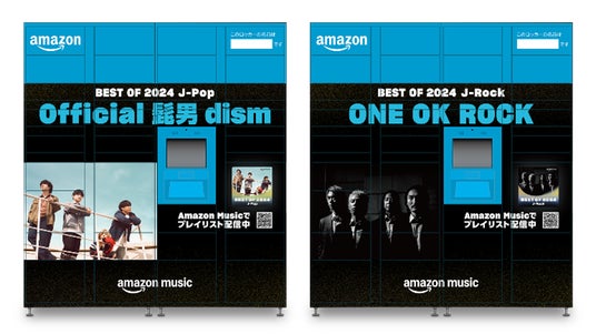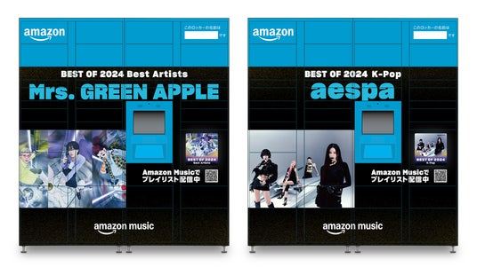 ジャンル別ランキングにもとづいて編成されたプレイリストの中でも、特に人気の高い「BEST OF 2024 Best Artists」、「BEST OF 2024 K-POP」、「BEST OF 2024 J-POP」、「BEST OF 2024 J-Rock」のトップを飾ったアーティスト(Mrs. GREEN APPLE、aespa、Official髭男dism、ONE OK ROCK)をあしらった4種類のデザインが施されます。音楽アーティストの特別デザインラッピングを施したAmazonロッカーが設置されるのは、国内初の試みです。