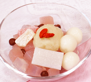 濃厚なミルク餡に苺寒天、もちもちの白玉を添えた季節限定あんみつです。