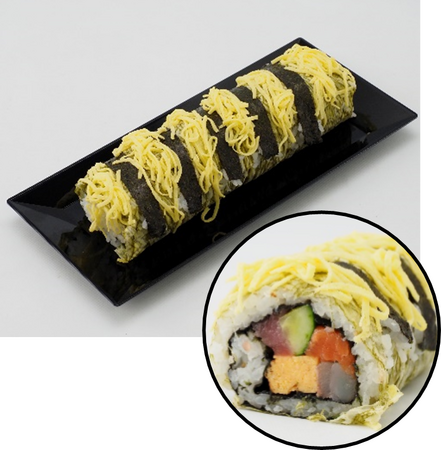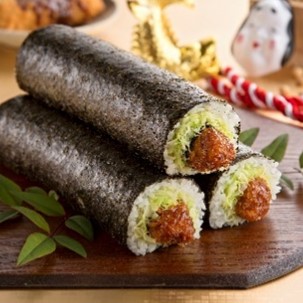 「アレッ!虎柄の中の具材は何かな?」と盛り上がること間違いなし!錦糸たまごと海苔で虎柄を表現し、中身が見えないように巻いた“アレ!?”な恵方巻。(※中身はまぐろ・鯛・ボイルエビなど)