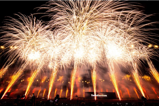 オープニングは「Continental Drift」でスタート。89年~90年の日本を含む、ワールドツアーもこの流れでライブがスタートすることが多く、ツアーを再現するかのような選曲に会場は一気にヒートアップした。本編の一曲目「Start Me Up」もライブのオープニングに選ばれることが多く、大迫力の花火と楽曲のシンクロに観客はおおいに盛り上がった。続くライブ定番曲「Brown Sugar」「Tumbling Dice」と、まさにライブさながら。また、東京競馬場にちなんでか、名バラード「Wild Horses」や、ライブで演奏されることは珍しい「She Was Hot」でも圧倒的な花火とともに夏の夜空を彩り、ファンを喜ばせた。最後を飾ったのは、65年にリリースされた彼らの代表曲「Satisfaction」のライブバージョン。81年以降はライブツアーのセットリストに定着、12年以降アンコールのラストを飾っている。2万3000人の観客を、ストーンズの音楽と、1周2kmに及ぶ馬場を縦横無尽に駆け抜けるシンクロ率100%の豪華花火の競演で魅了した。