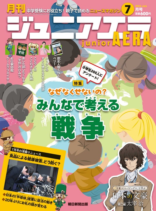 親子で楽しく読めて、中学受験・高校入試の勉強にも役立つ、小中学生のためのニュース月刊誌「ジュニアエラ」。今月号の特集は「なぜなくせないの? みんなで考える戦争」。小学生200人にアンケートした戦争に関する疑問について考えます。ニュース解説では、「食品による健康被害」「半導体」「新紙幣」をくわしく解説。人気連載「『文豪ストレイドッグス』で学ぶ 日本の文豪」は、太宰治が登場します。2024年6月14日(金)発売です!