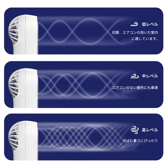 【冷却機能/3段階風速調整/わずか159g軽量/コンパクト/最大4時間動作する2000mAh大容量バッテリー/USB-C充電】