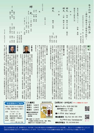 2009年、横浜開港150年記念に、第1回よこはま能の会が横浜能楽堂で「海の日」に開催される。2019年、よこはま能の会実行委員会が発足、梅若研能会から引き継ぎ、今回で第14回を迎える。