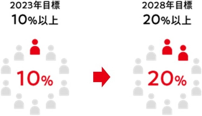 株式会社ロッテでは、多様な従業員が活躍することがイノベーション創出の原動力であり、企業競争力の源泉であると考え、DEIを推進しています。その一環として、日本全体の課題でもある女性活躍に取り組んでおり、2023年度までに国内の女性管理職比率を10%以上にすること、さらに2028年度までに20%以上にすることをESG中期目標に掲げています。2022年3月末時点の実績は9.9%(株式会社ロッテおよび国内子会社)でした。