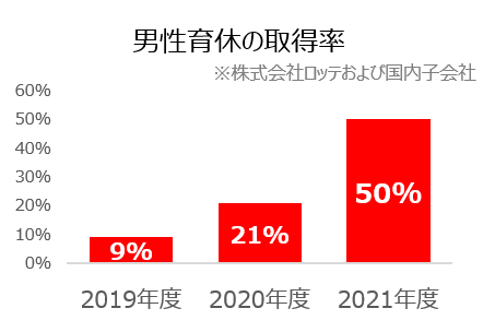 株式会社ロッテでは、出産や育児などのライフイベントを迎えた際も安心して働き続けられるよう、様々な支援を行っており、男性育休の取得推進にも力を入れています。男性育休取得者と職場メンバーの体験談を社内で共有し、ライフイベントが女性だけのものという意識を変えるとともに、業務の属人化を解消し、職場のチームワーク向上に努めた結果、ここ2年で男性育休の取得率が大きく飛躍しました。