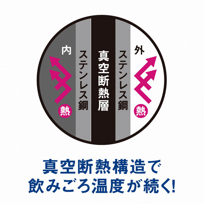 真空断熱構造で飲みごろ温度を長時間キープ!保冷・保温力抜群なので、ホットにもアイスも!