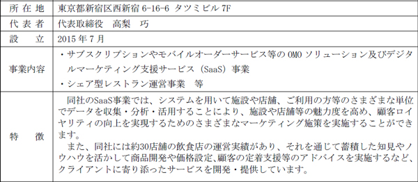 favy社は、商業施設等における先進的な各種サービスの提供や、シェア型レストランというユニークな業態の飲食店の企画・運営など、独自の強みを発揮して成長を遂げており、デジタルマーケティングに関する知見が豊富な企業です。今後は、当社グループのさまざまな事業領域で同社と協業を進め、お客様の利便性の向上や新たなサービスの提供等に取り組んでまいります。