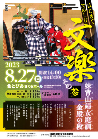 (公財)北区文化振興財団 /城北演劇を観る会主催、『はじめてたのしむ文楽 その参』が2023年8月27日 (日)に北とぴあさくらホール(東京都北区王子1-11-1)にて上演されます。チケットはカンフェティ(運営:ロングランプランニング株式会社、東京都新宿区、代表取締役:榑松 大剛)にて発売中です。