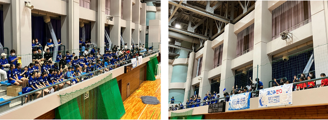 会場内にはハンドボールをしている小学生未満~高校生まで多くの子供たちが多く、ブルーサンダーのカラーであるブルーの服装をしたキッズが多くみられました。ハーフタイムでは、海洋ごみ問題に対するクイズを行い、積極的に手を挙げて参加する子供たちが多く、クイズを通して若年層への訴求をすることができました。