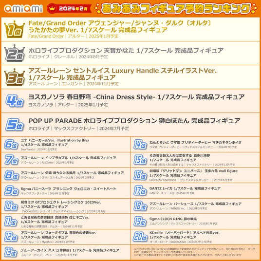 大網株式会社(東京都文京区)は、自社が運営するホビーショップ『あみあみ』の2024年2月フィギュア予約ランキングを発表いたしました。■あみあみ2024年2月フィギュア予約ランキング上位のフィギュアを動画でもご紹介中