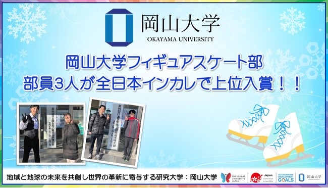 今回の結果を受けて、杉山さんは「今大会では5位入賞という結果でしたが、来年も入賞を目指して頑張りたいです」と話し、本宮さんは「目標としていた舞台で健闘できて嬉しいです。共に切磋琢磨し、応援してくれた部員に感謝したいです」と話していました。今後もフィギュアスケート部の活躍から目が離せません!今後も岡山大学フィギュアスケート部への応援をよろしくお願いします!