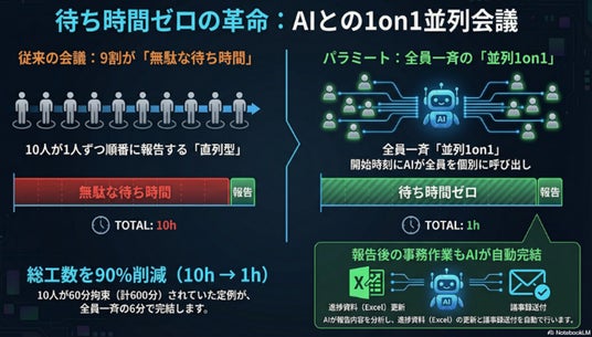 【会議時間を1/10に圧縮!定例報告の「待ち時間」をゼロにするAIファシリテーター】 「パラミート」は、従来の会議を”並列化”することで、チームの生産性を劇的に向上させるWeb会議ソリューションです。