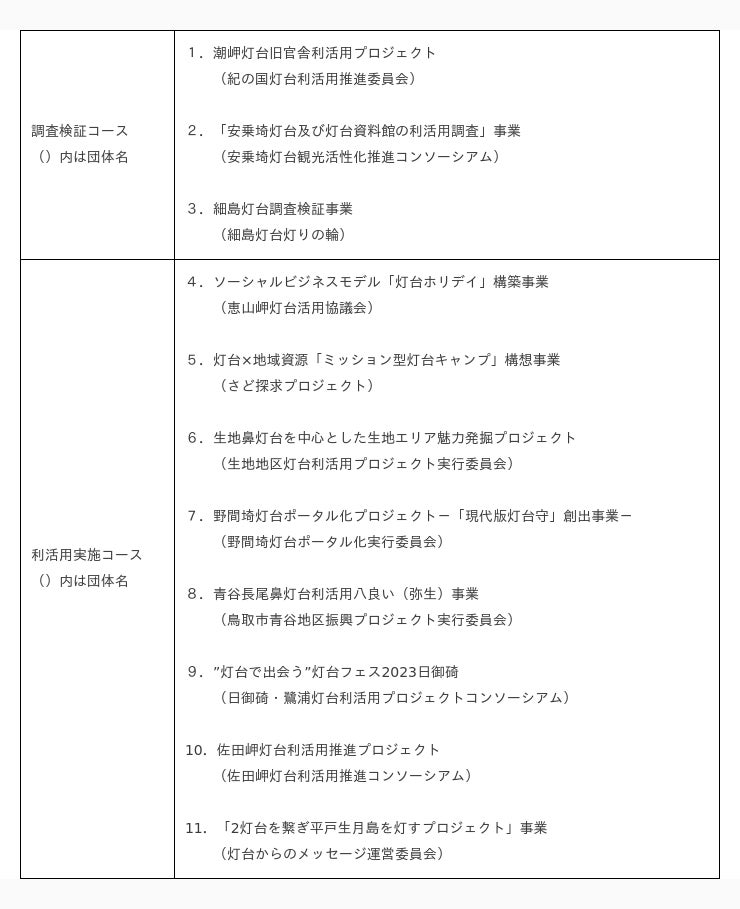 <新たな灯台利活用モデル事業 2023年度採択事業一覧>