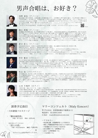 東京藝術大学出身の声楽家・ピアニストによる、男声合唱を取り上げた少人数アンサンブルコンサート。第1部では日本歌曲のソロステージ、第2部では男声合唱定番の多田武彦から、シューマンの代表作「詩人の恋」を少人数アンサンブルでお届けします。少人数ならではのハーモニーを是非お聞きください。