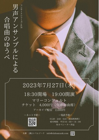 株式会社シバムジーク主催、『男声アンサンブルによる合唱曲のゆうべ』が2023年7月27日(木)にマリーコンツェルト(東京都板橋区)にて開催されます。チケットはカンフェティ(運営:ロングランプランニング株式会社、東京都新宿区、代表取締役:榑松 大剛)にて発売中です。
