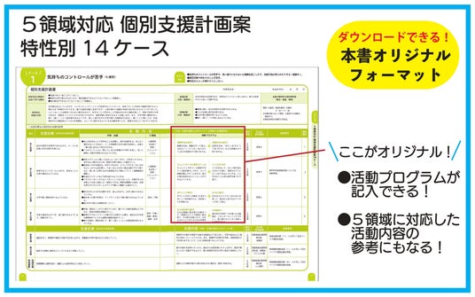 「気持ちのコントロールが苦手」「ことばの発音が不明瞭」「スムーズなコミュニケーションが難しい」など、特性別に個別支援計画案を14ケースご紹介。本書オリジナルフォーマットは、活動プログラム記入欄つき。5領域の関連を踏まえた具体的な活動プログラムを設定することで、支援の方向性がより明確に。5領域に対応した支援内容の参考にもなります。