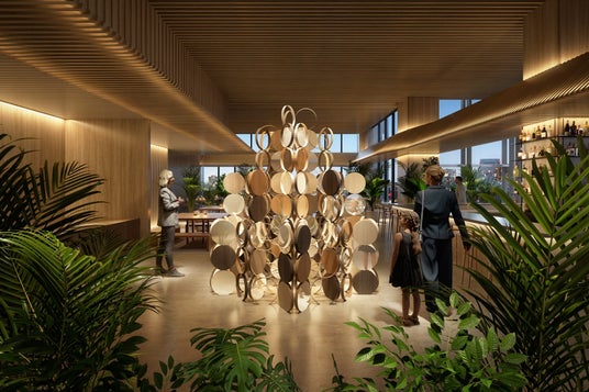 「開発が進み、日々変化する若々しい街、虎ノ門。明るい『森』をイメージした高い天井のロビー空間に、『木漏れ日』が集まったようなツリーをデザインしました。」 - 隈研吾