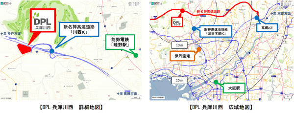 「DPL兵庫川西」は、新名神高速道路「川西インターチェンジ」から約800m と近畿エリアから中国・四国エリアまで短時間でアクセスできる場所に位置しています。加えて、能勢電鉄妙見線「畦野駅」から約3.3km で、近隣には住宅団地「阪急北ネオポリス」をはじめとした大規模ニュータウンもあるなど職住近接の就労環境が整っています。