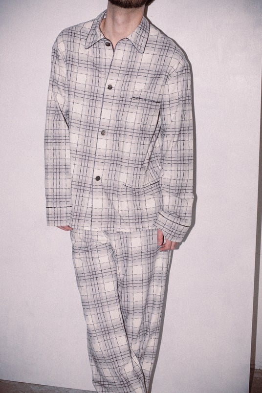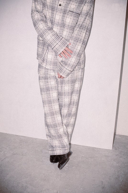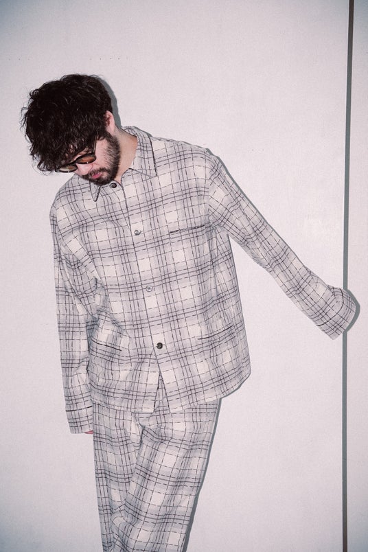 中村は「アメリカらしいシャツが欲しい」という要望を投げかけ、それに応える形で赤羽氏が持ち出したアイテムは、古着屋・PITTZZで数日前に購入したという、とあるパジャマシャツ。それは中村も試着して購入を検討していたものだったという。偶然の一着をベースに、ブラックバードがブランド創立直後にリリースしていたフランネルのパジャマセットアップを参照して制作することが決まった。白地にグレーの絣(かすり)のようなチェック。パイピングと丸みのある襟。リラックスでありながらエレガント。ヨーロッパとアメリカ、どちらの空気も感じるような逸品が生まれた。