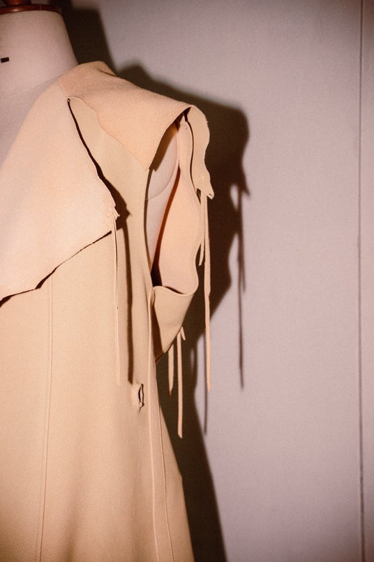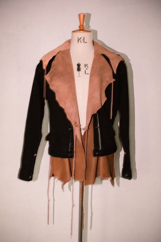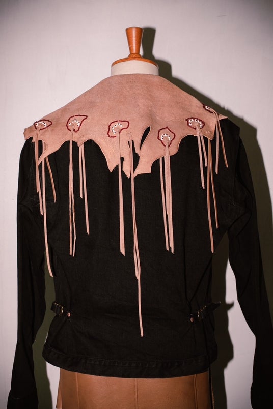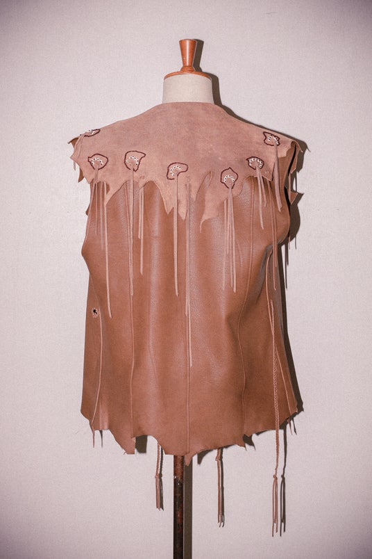 ファッションにまつわる繊細な感覚を共有する二人。日々メッセージを交わす中で、自然と何か一緒に作ろうという流れになったのだそう。まず制作のヒントとなるような私物をそれぞれが持ち寄って、そこから別注商品を立ち上げていく。まず一つの共通点となったのはレザーのアイテム。特に70年代を象徴するサンフランシスコのレザーブランド・イーストウェストのアイテムが彼らの気分を象徴していた。ロックミュージシャンのステージ衣装として愛されてきたブランドで、ミックジャガーも愛用していた代物。ハンドクラフトを多用した豪奢でありながら人の体温を感じる70年代らしいレザージャケットをスタート地点に、切りっぱなしのレザーベストを企画。ディアスキンを用い、フリンジとヴィンテージビーズをふんだんに使用した、スペシャルなピースが形に。