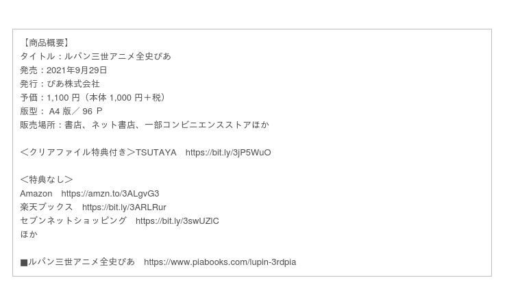 ■ルパン三世アニメ全史ぴあ https://www.piabooks.com/lupin-3rdpia