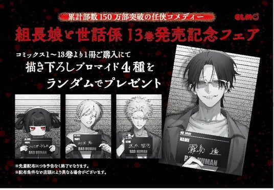 マイクロマガジン社(東京都中央区)は、コミックELMO『組長娘と世話係』(漫画:つきや)の最新刊発売(13巻12月11日発売)を記念したフェアを全国の対象書店にて12月6日(金)より順次開催いたします。