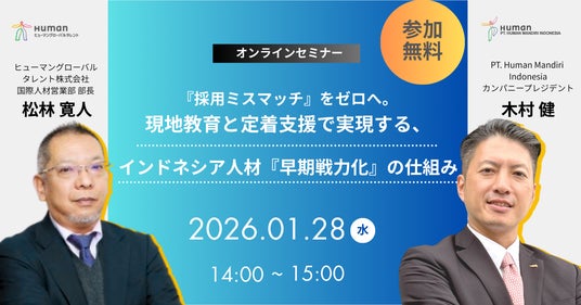 - 無料オンラインセミナー「『採用ミスマッチ』をゼロへ。現地教育と定着支援で実現する、インドネシア人材『早期戦力化』の仕組み」を2026年1月28日(水)14:00~15:00に開催