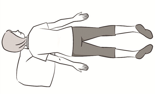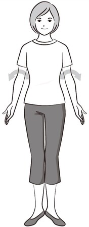 両腕を下げたまま、手のひらを外側に向けるように限界まで腕を10秒ねじる。