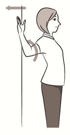 痛みが出るほうの腕を真横に上げ、一歩前に出て、体の後方に腕を10秒ねじる。