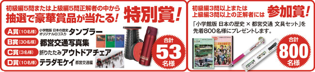 特別賞: 初級編、上級編のいずれか5問正解された方の中から抽選で、合計53名様に「小学館版 日本の歴史」オリジナルロゴ入りタンブラーや都営交通写真集などのグッズをプレゼント。