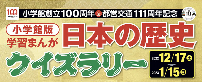 2022年12月1日(木)に発売した『小学館版 学習まんが 日本の歴史』。発売からわずか1週間で重版がかかるなど、好調な売れ行きを見せています。そして今回、『小学館版 学習まんが 日本の歴史』が、今年111周年を迎える都営交通とコラボし、12月17日(土)から「日本の歴史クイズラリー」を実施します。