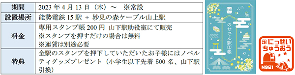 開業110周年を記念して、各駅をめぐり楽しんでいただける駅スタンプを設置します。能勢電鉄ならではの駅名と駅にちなんだイラストで親しみやすいスタンプをお楽しみいただけます。