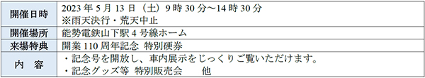 例年開催しているのせでんレールウェイフェスティバルについて、今回は開業110周年記念号を使用し、より多くのお客様にお越しいただけるよう一部内容を変更して開催します。