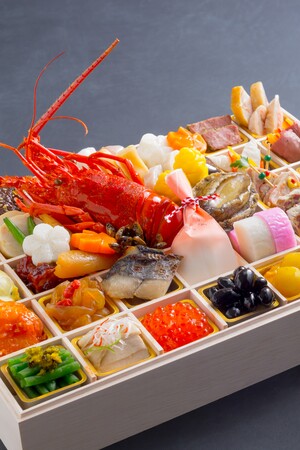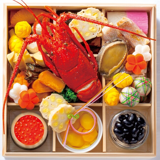【日本料理】 伊勢海老/あわび旨煮/数の子醤油漬け/菜の花/栗きんとん/いくら醤油漬け/黒豆/甘鯛西京焼き/和牛山椒焼き/鮎昆布巻き/竹の子煮/からすみ/梅人参/梅長芋/うなぎ八幡巻き/さごし生寿司/千枚蕪/田作り/辛子蓮根/裏白椎茸/河豚竜田揚げ/網笠柚子/紅白蒲鉾/手毬麩/くわい含め煮