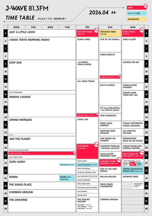 ラジオ局J-WAVE(81.3FM)は、2026年4月1日より春の番組改編を実施します。(改編率6.9%)