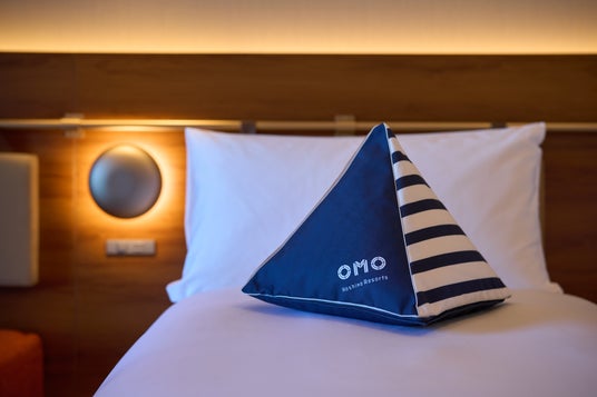 また、客室「デラックスツインルーム」や「OMOハウス」は、船のキャビンをイメージした温かみのあるデザインです。船の帆をイメージしたクッションや、革のストラップで支えられたヘッドボード、真鍮色のレールにより、クラシックな船旅の雰囲気を演出しています。