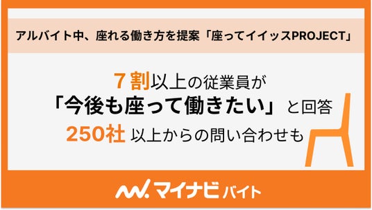 本プロジェクトおよび、「マイナビバイトチェア」の導入について多くの賛同意見が集まり、座って働けることは働き手にとっては快適なアルバイト環境、雇用主にとっては人材確保や定着のきっかけになる可能性があることが明らかになりました。引き続き『マイナビバイト』では求人メディアである特性を活かし、働き手・雇用主双方にとってよりよい職場環境を整えていくための取り組みを推進してまいります。