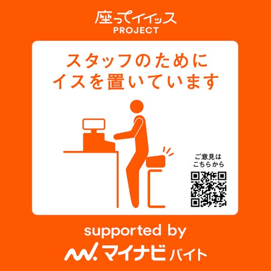 株式会社マイナビ(本社:東京都千代田区、代表取締役 社長執行役員:土屋芳明)が運営するアルバイト情報サイト『マイナビバイト』(https://baito.mynavi.jp)は、アルバイト中の“立ちっぱなし”問題の解決を目指す「座ってイイッスPROJECT」を2024年3月より開始し、独自に開発したスタッフ専用イス「マイナビバイトチェア」の試験導入を4月末まで実店舗で行いました。5月末からは本格導入の案内を開始し、7月23日時点で約40社にイスを発送し、9月を目途に約100社の導入を予定しています。そして新たに本プロジェクトに関する店頭設置用のステッカーとチラシを制作し、「マイナビバイトチェア」導入企業に配布しました。来店したお客様に対してもプロジェクトを周知することで、座って働くことが当たり前になる環境づくりを目指します。