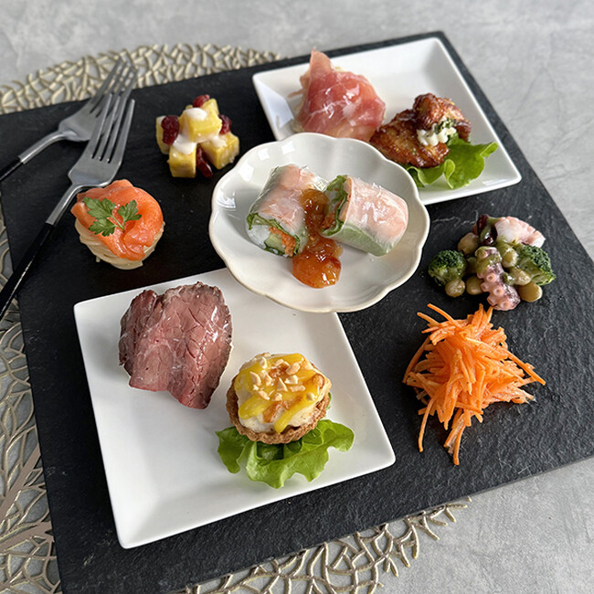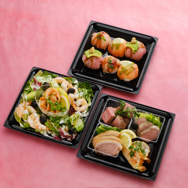 ローストビーフのパヴェ仕立てや合鴨、サラダ、可愛らしい見た目のお寿司などを詰め合わせました。赤身のお肉には赤ワインがおすすめ。