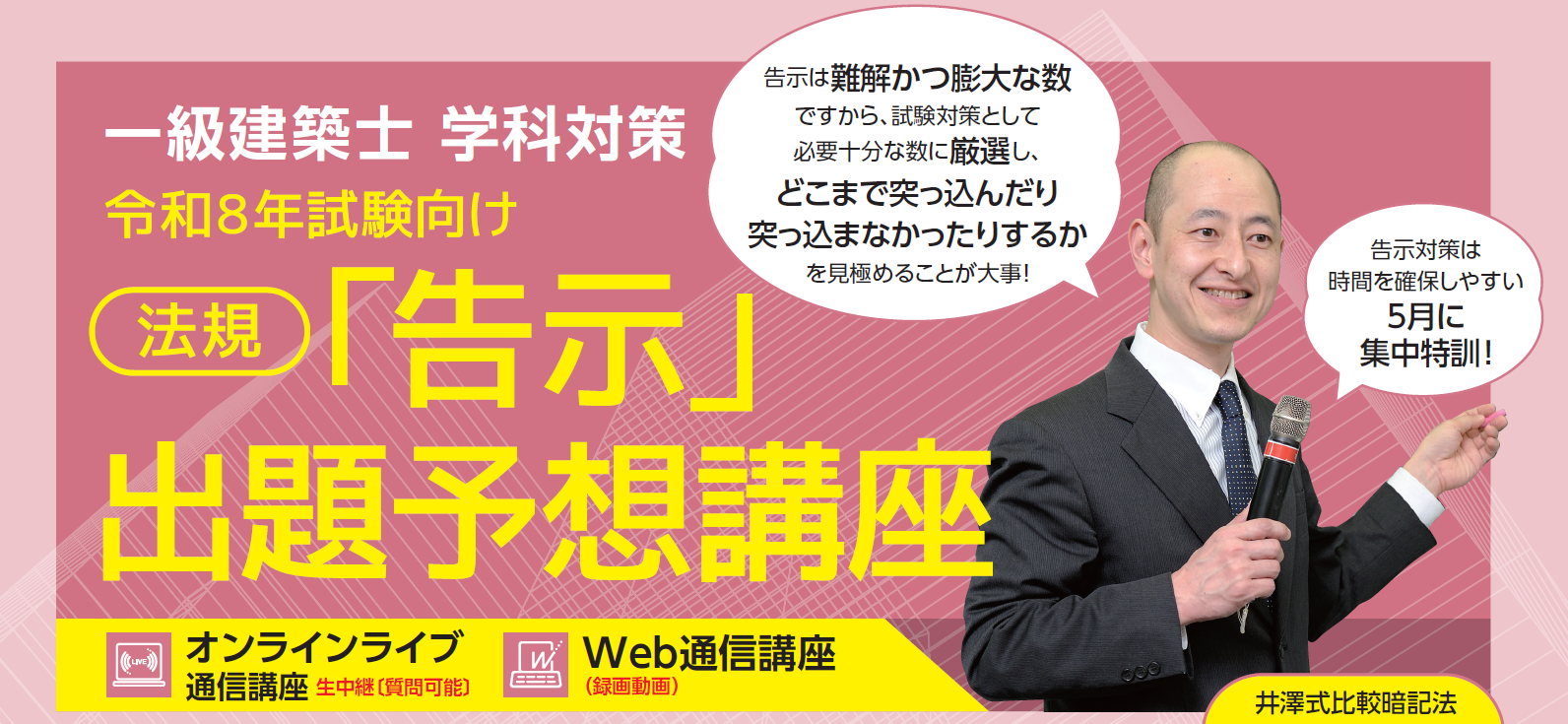 そこで今年度も告示専用の講座をご用意しました。難解かつ膨大な数の告示の中から、試験対策として必要かつ十分な50本(TAC法令集「本編」に掲載の42本+「追録」に掲載の新設告示8本)を厳選し、渾身の予想問題も使いながら、対策方法を丁寧に説明します。告示対策はTACにお任せください!