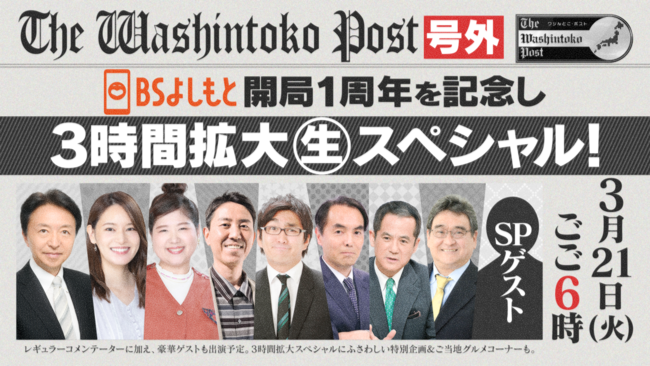 BSよしもとは、2023年3月21日(火・祝)に開局から1周年を迎え、1周年を記念して「BSよしもと開局1周年ワシんとこ・ポスト!3時間生放送スペシャル」(18:00~20:59生放送)をお届けします。